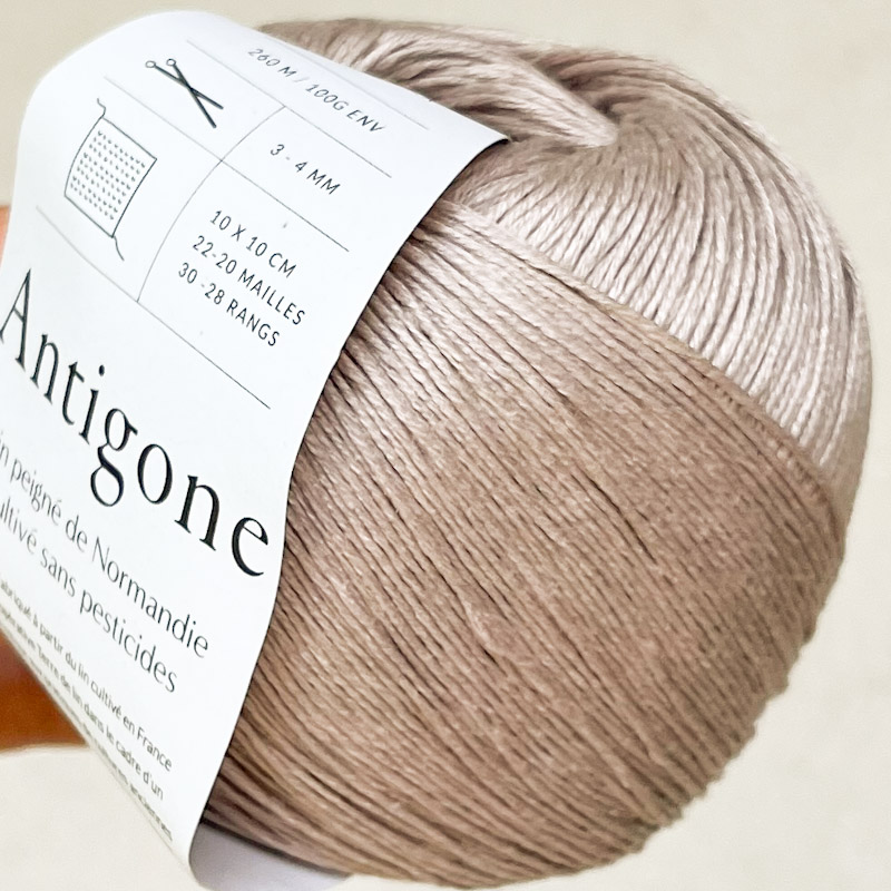 Antigone je vyrobená z ľanu pestovaného v Normandii družstvom Terre de lin ako súčasť projektu návratu k starým kultivačným postupom zameraným na ochranu pôdy a výrobu vysokokvalitných vlákien bez chemických vstupov. Tieto dlhé vlákna sú pradené za mokra v Litve s veľkou starostlivosťou, aby vytvorili pravidelnú, mäkkú a prirodzene lesklú priadzu. Priadza sa potom skrúca a farbí vo Francúzsku v oblasti Creuse.