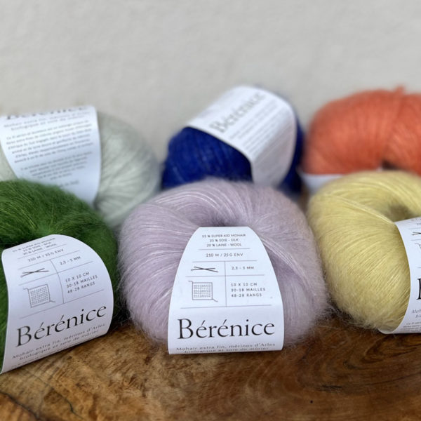 Bérénice je jedinečná zmes extra jemných vlákien angorských kôz (z juhoafrických fariem, ktoré sa zaviazali k dobrým životným podmienkam zvierat),  mäkkučkej organickej vlny Merinos d’Arles, spriadaných do slučiek okolo silnej, lesklej hodvábnej priadze. Následne česanej, aby vznikol strapatý, objemný vzhľad.